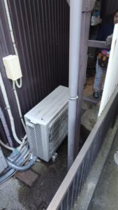 既存給湯器はお家の裏側へ設置されており、人力にて搬出作業を行うことが出来ずユニック車を使用しての作業です。