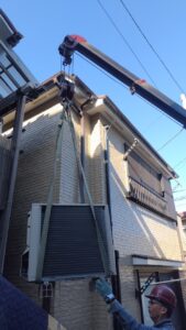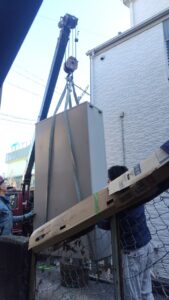新しい貯湯タンクユニットを吊り上げ、設置場所まで移動させます。