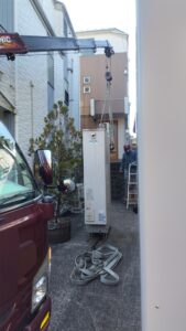 既存給湯器をベルトで固定しユニックへ繋げ既存給湯器の搬出を行いました。省スペースでの作業も難なくこなすプロの作業はさすがです。